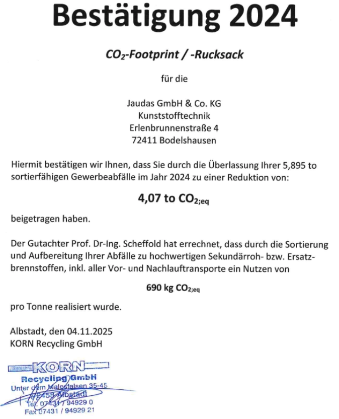 Jaudas' commitment to sustainability:Sustainability is a concept that ensures that the needs of the present are met without compromising the opportunities of future generations. It is based on three equally important pillars: the ecological, social and economic dimensions. In concrete terms, this means using natural resources responsibly, promoting social justice and ensuring stable economic development. Examples include resource conservation, environmental protection and fair working conditions. Ecological dimensionResource conservation:Do not consume more resources than can be regenerated (e.g. use wood-based regranulate, i.e. renewable raw materials).Environmental protection:Minimise environmental damage caused by the consumption of raw materials (e.g. save energy, avoid waste, use environmentally friendly alternatives).Biodiversity:Take measures that support the preservation of biodiversity. Social dimensionSocial justice: Creating equal opportunities for all people within and between generations by utilising production in Germany.Participation:Involve all affected parties in decision-making processes.Responsibility:Taking responsibility for the impact of one's own actions by choosing sustainable value creation.Economic dimensionEfficiency: Designing economic activities in such a way that they are ecologically and socially sustainable.Long-term nature: Ensuring long-term economic stability rather than short-term profits.Implementation in everyday lifeConsumption:Buy regional products, eat less meat, prefer second-hand goods and consume more consciously.Mobility:Switch to public transport or form car pools.Resources:Save water and energy.Commitment: Become politically active to promote sustainability and support companies that pursue sustainable practices.